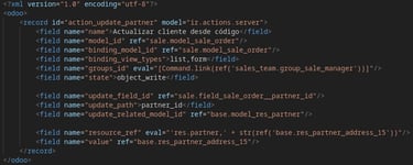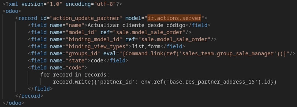 Dentro de un módulo personalizado declaramos un registro del modelo ir.actions.server con el siguiente código: