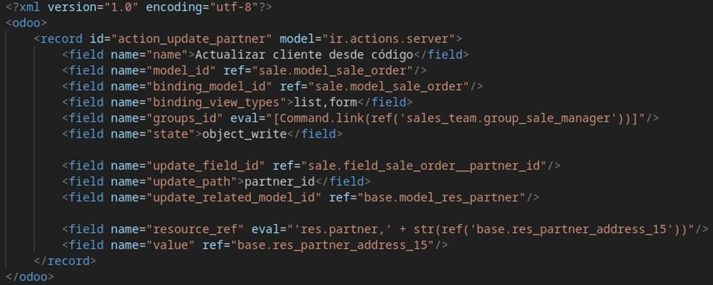 - update_related_model_id: Es el modelo al que apunta el campo a cambiar. En este caso, el modelo es res.partner (Clientes).