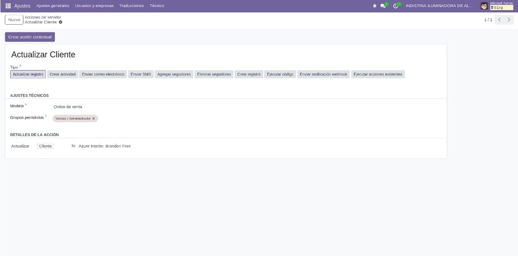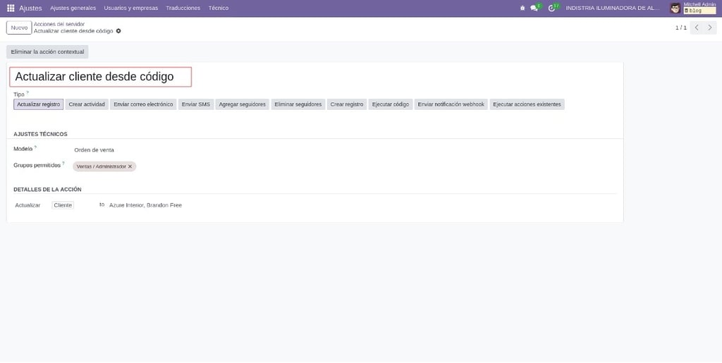 - Grupos permitidos: Ventas / Administrador (estos son los grupos de usuario que pueden ejecutar la acción del servidor. Si se deja en blanco, permite a todos ejecutar la acción). - En la sección Detalles de la acción, se ingresa Actualizar, campo Cliente, y se selecciona el cliente por el cual se quiere cambiar. En este ejemplo se colocó el cliente Azure Interior, Brandon Free.