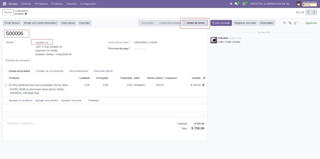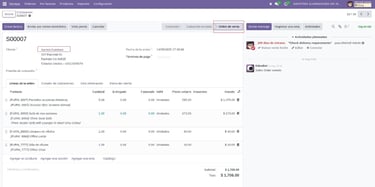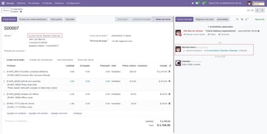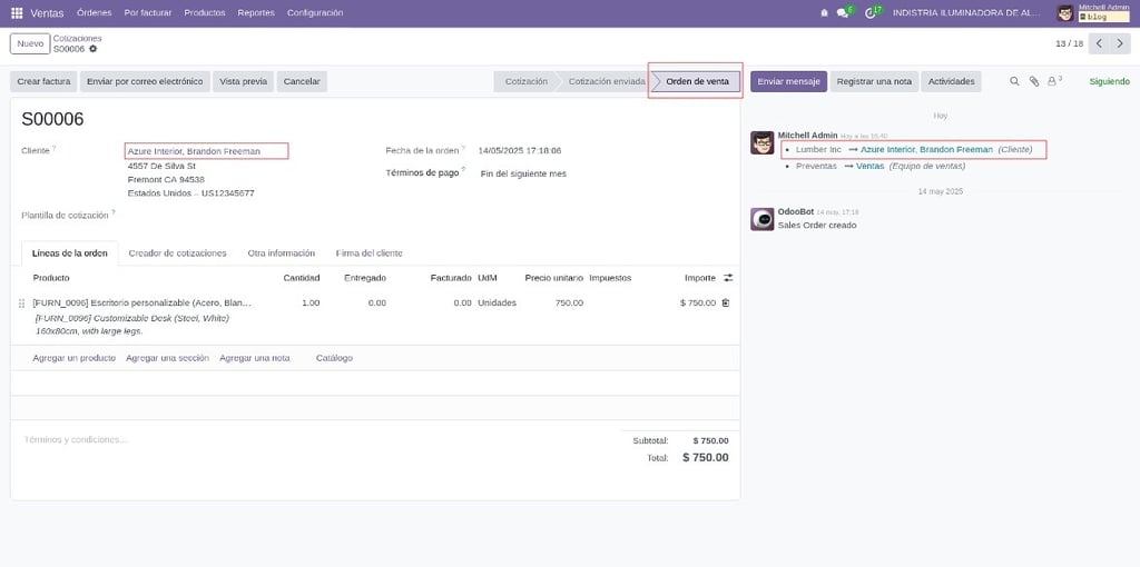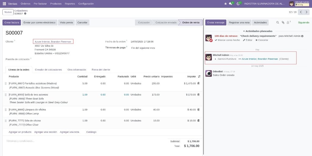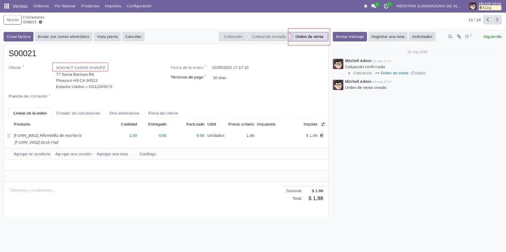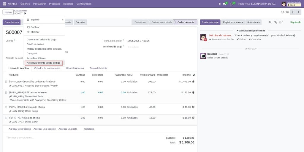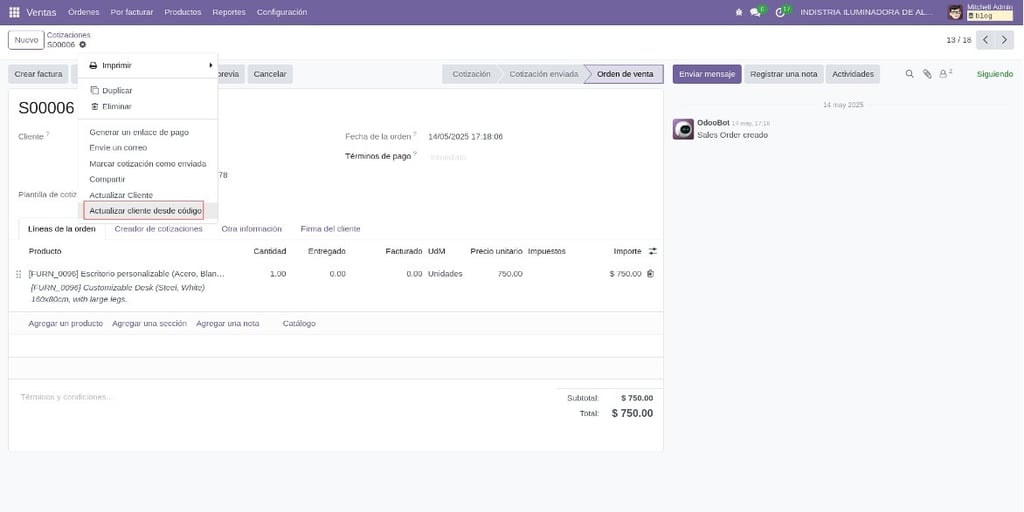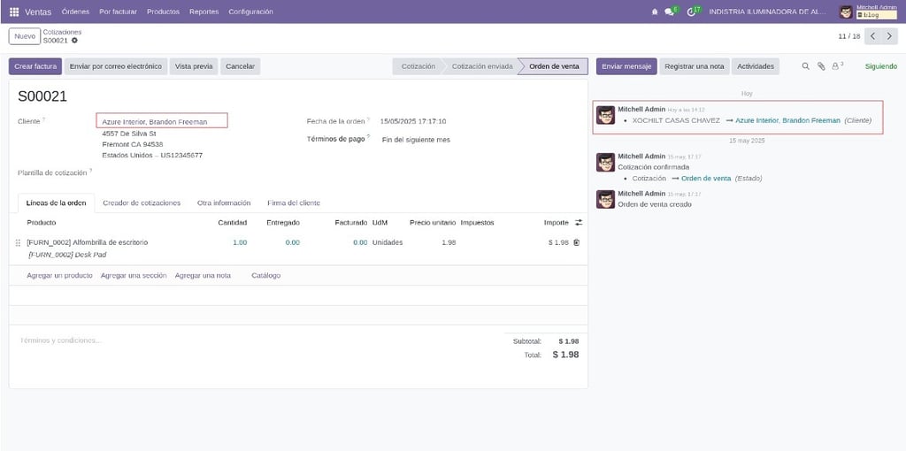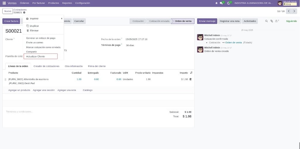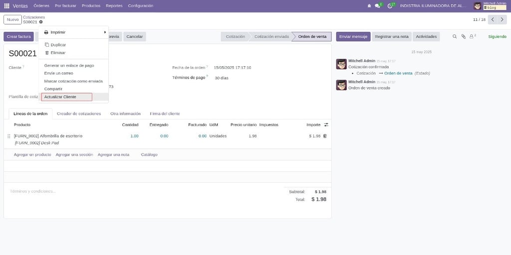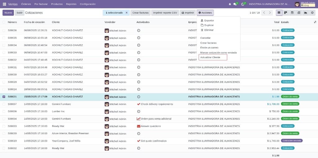 Normalmente, el modelo no permite actualizar la venta anterior si su estado es “Orden de venta”, pero al accionar la acción de servidor desde el menú de acciones, notamos cómo se actualiza el cliente por el que configuramos.