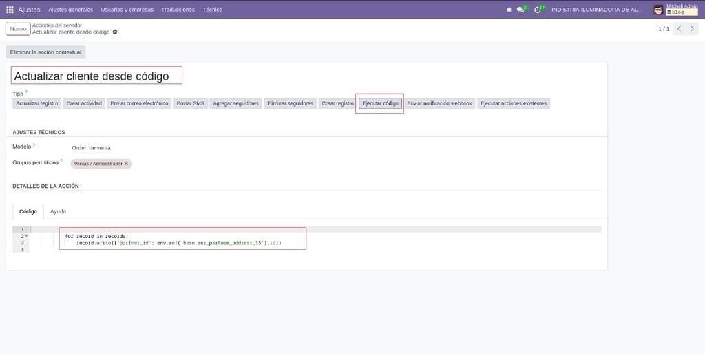 - code: Es el código a ejecutar en la acción de servidor. En este ejemplo, llamamos al método write que contiene cada modelo, y especificamos el nuevo registro a colocar en el campo partner_id.