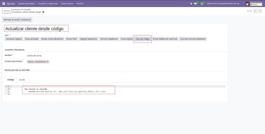 Aunque el ejemplo anterior termina siendo muy poco práctico, ya que se requiere saber nombres técnicos de campos específicos en la acción y referencias de los campos a actualizar y nuevo campo a colocar. Por lo que a la acción anterior le cambiaremos el tipo por “Código” y la simplificamos. El código de la acción es el siguiente: