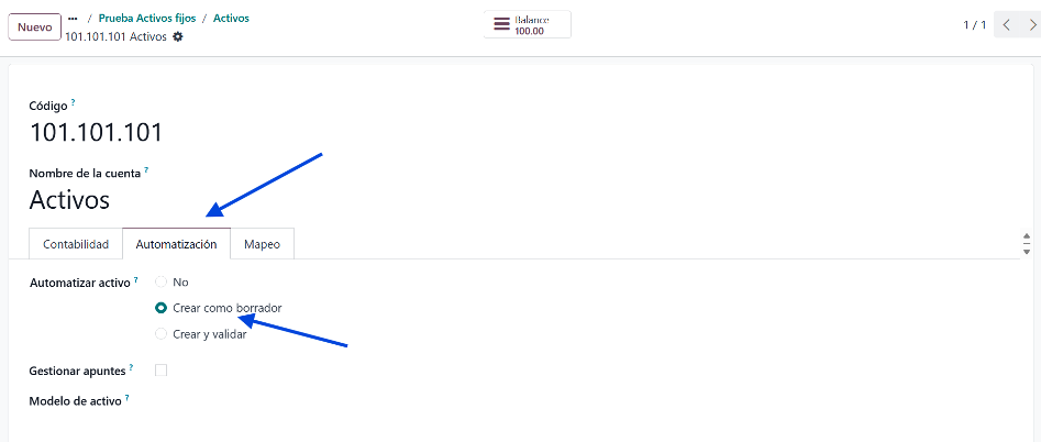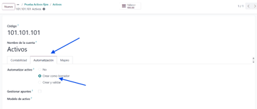 En la pestaña Automatización en la cuenta contable, la cual solo aparece disponible si es de tipo activo fijo, contamos con tres opciones para la creación de activos fijos: no crear, crear en borrados o crear y validar. Las últimas dos mencionadas crearán el activo de manera automática; se recomienda utilizar el creado en borrador para que se pueda asegurar que los datos del activo fijo sean correctos.