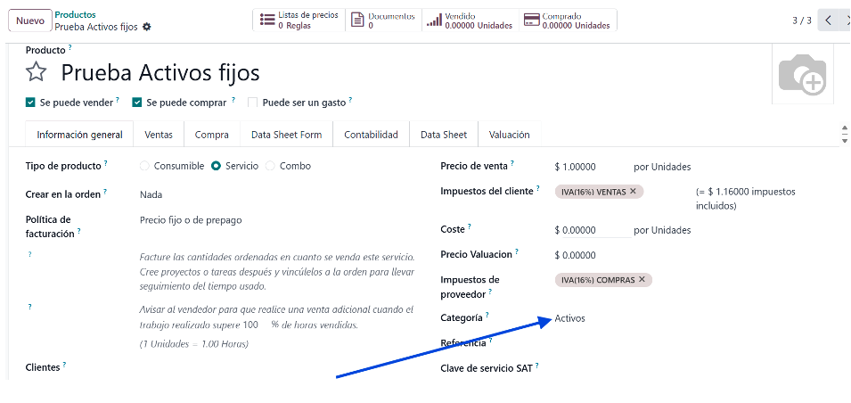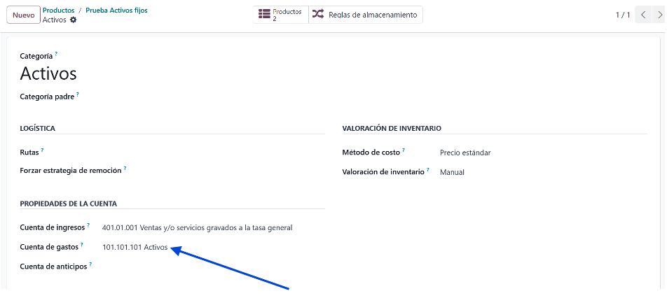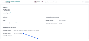 La categoría del producto en su configuración debe tener una cuenta contable de gastos de tipo activo fijo y esta debe estar configurada para realizar activos automáticamente; lo maestro a continuación: