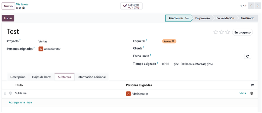 Proyectos → Tareas → Abrir tarea → Subtareas