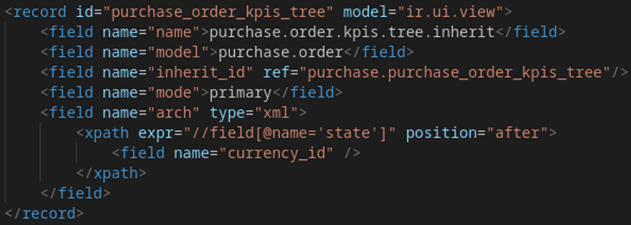 A partir de la vista anterior, creamos una nueva vista con herencia primaria dentro de un módulo personalizado. En esta nueva vista agregaremos la columna Moneda después de la columna de Estado. El código de la nueva vista es el siguiente: