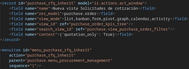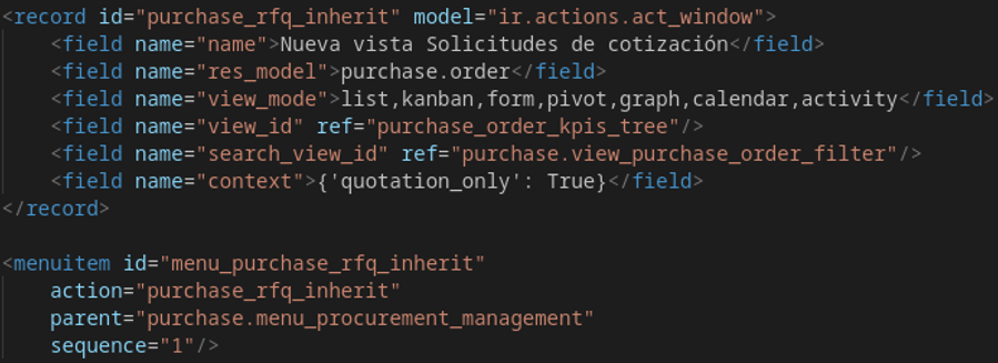 También agregamos una acción y un elemento de menú para mostrar la nueva vista con herencia primaria creada. El menú se llama Nueva vista Solicitudes de cotización y se agrega después del menú Solicitudes de cotización original. El código para este menú es el siguiente: