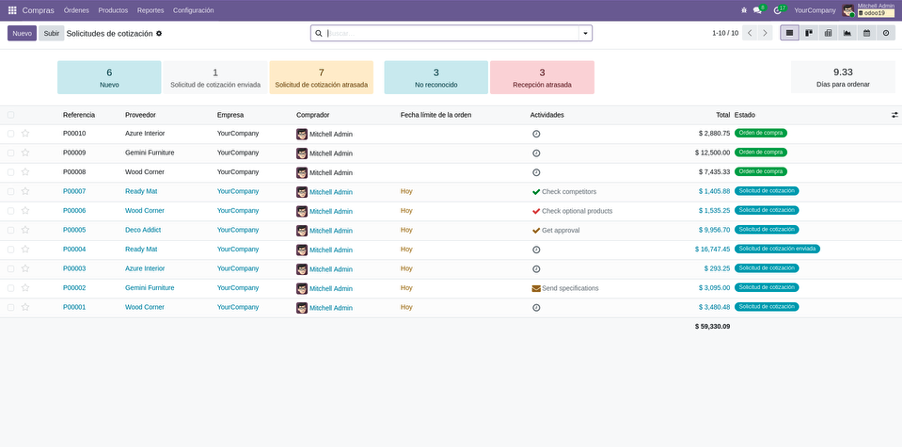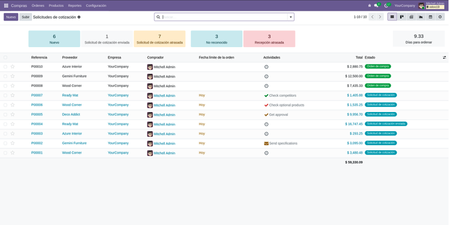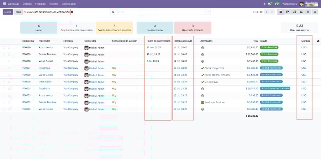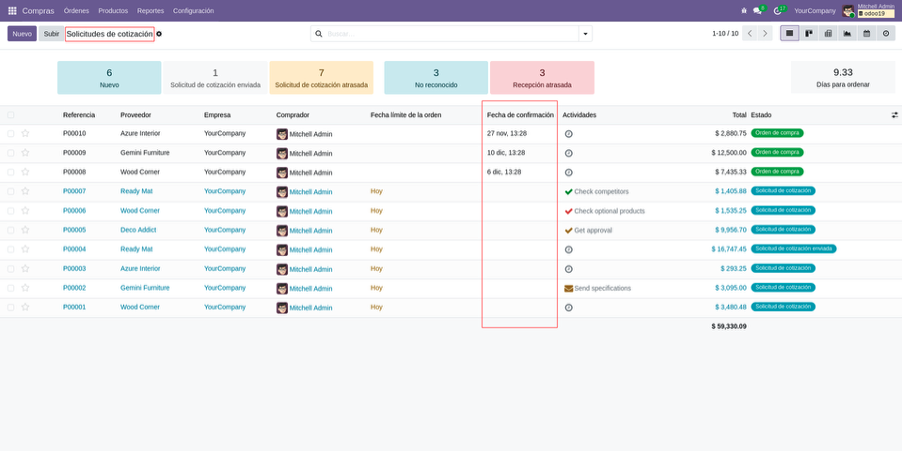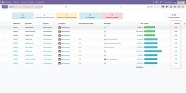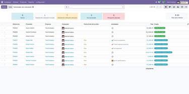 Sin embargo, al regresar a la vista original de Solicitudes de cotización (cuyo nombre técnico es purchase.purchase_order_kpis_tree), notamos que esta nueva columna no está: