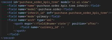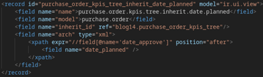 Por último, creamos una vista que herede a la vista creada con herencia primaria, es decir, la vista Nueva vista Solicitudes de cotización. Agregamos la columna Entrega esperada después de la columna Fecha de confirmación. El código se ve de la siguiente manera: