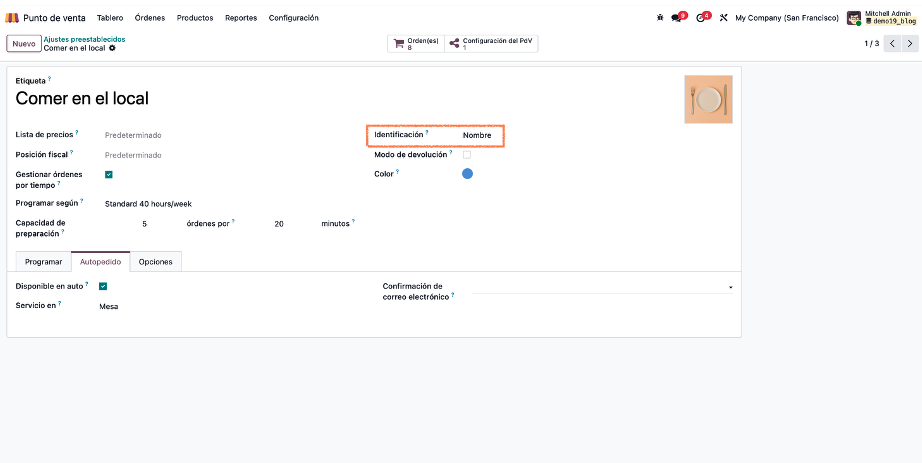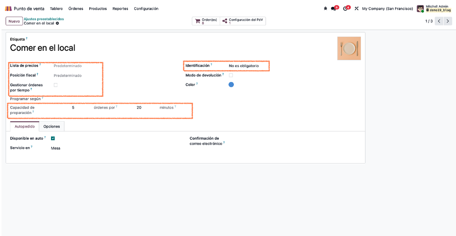 Estas configuraciones nos ayudan para definir una lista de precio, un color diferente dependiendo de qué ajuste se seleccione, para gestionar las órdenes de ese tipo por tiempo, para establecer si necesita una identificación o una dirección para registrarlo: