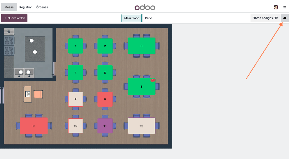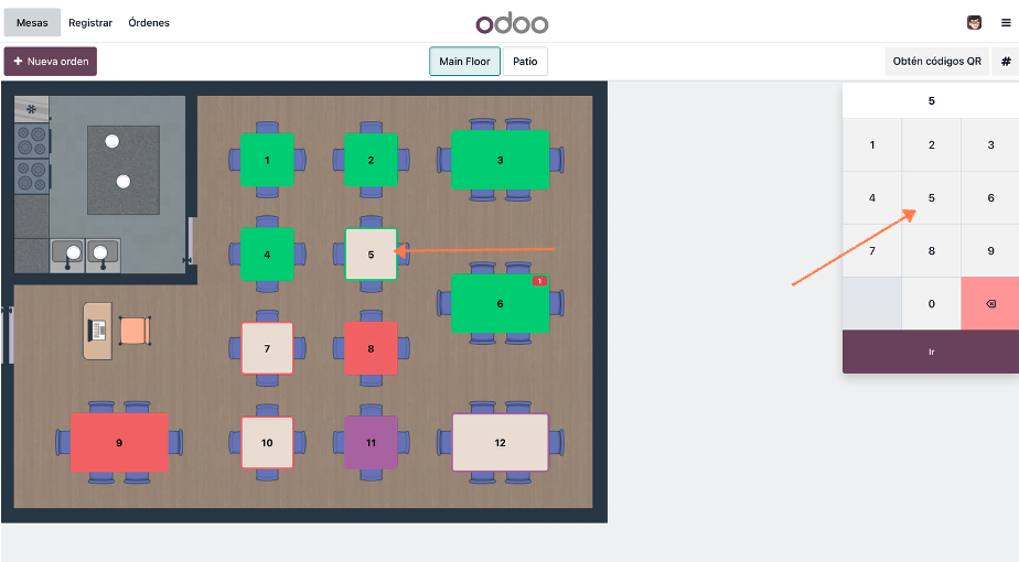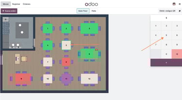 Ahora, si queremos asignar una mesa, podemos hacerlo simplemente dando clic en el lugar correspondiente o podemos escribir el número. Para esto vamos a la esquina superior derecha y le damos clic en el “#”.