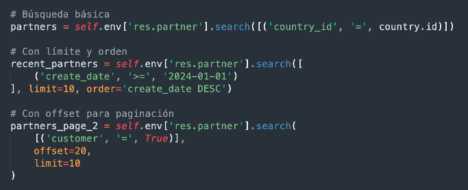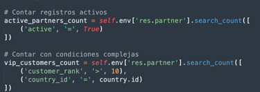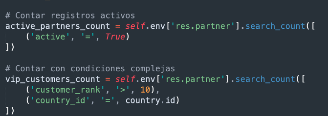 - Contar registros (search_count): Cuenta el número de registros que coinciden con el dominio.