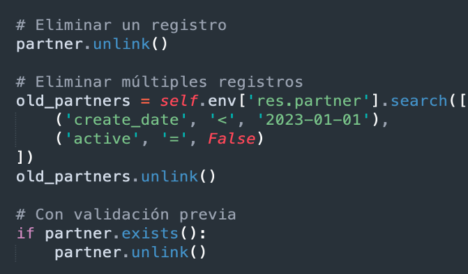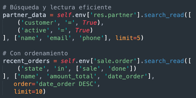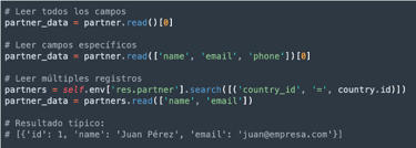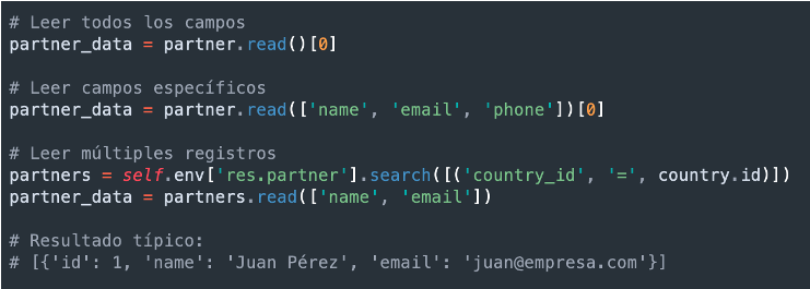 - Buscar y leer (search_read): Combina búsqueda y lectura en una sola operación.