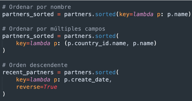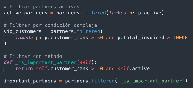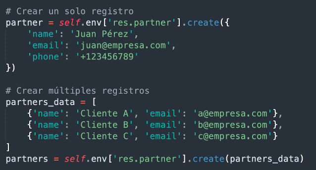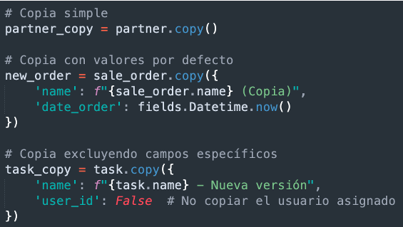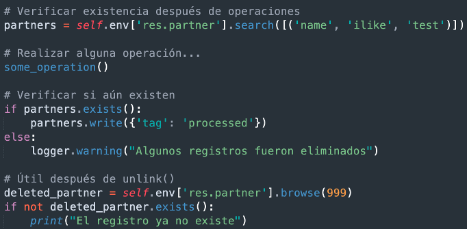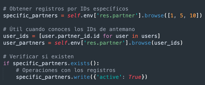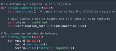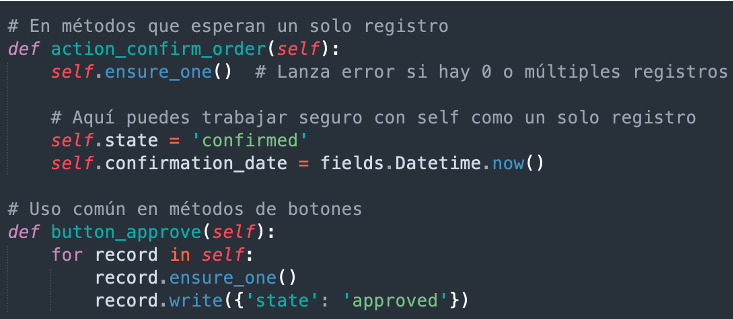 - Asegurar un registro (ensure_one): Garantiza que el recordset contiene exactamente un registro.