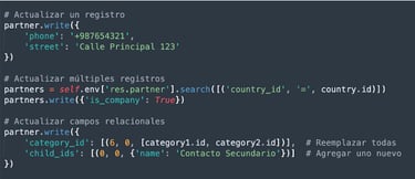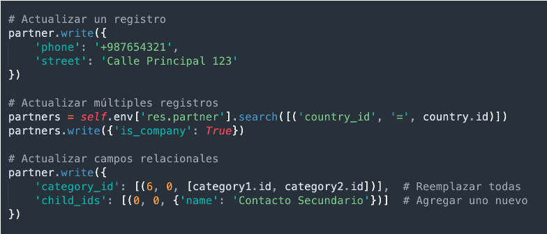 - Actualizar registros (write): Actualiza campos de uno o múltiples registros.