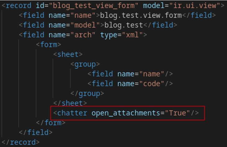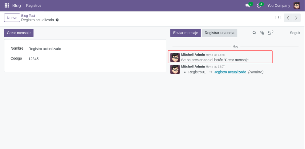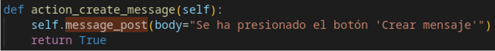 Para ejemplificar el uso de una de las funciones anteriores, se añade un botón dentro de la vista formulario del registro anterior, el cual llama a un método que hace uso de la función message_post que fue añadida por el mixin. El botón es el siguiente: