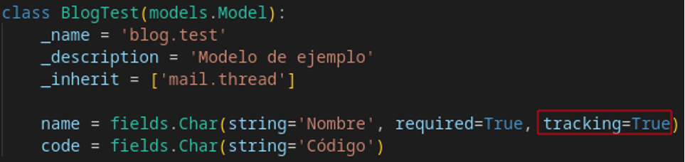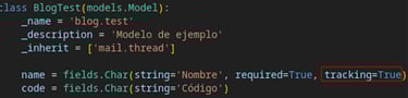 El mixin mail.thread añade un potente sistema de seguimiento de campos, que permite registrar cambios en campos específicos en el chatter del registro. Para añadir seguimiento a un campo, simplemente se añade el atributo de seguimiento (tracking) establecido como verdadero. Por ejemplo:
