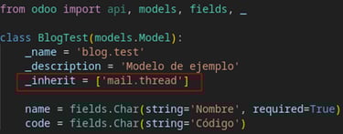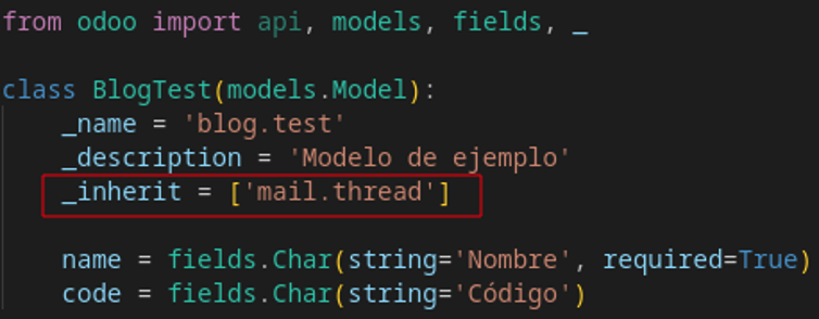 Para añadir las funcionalidades del mixin mail.thread dentro de este modelo personalizado, lo añadimos dentro de sus herencias, en su definición dentro de la clase Python. El módulo personalizado debe tener como dependencia al módulo “mail”; si no se tiene, al actualizar el módulo se presenta un error en la terminal y no permite añadir la herencia, ya que no la encuentra.