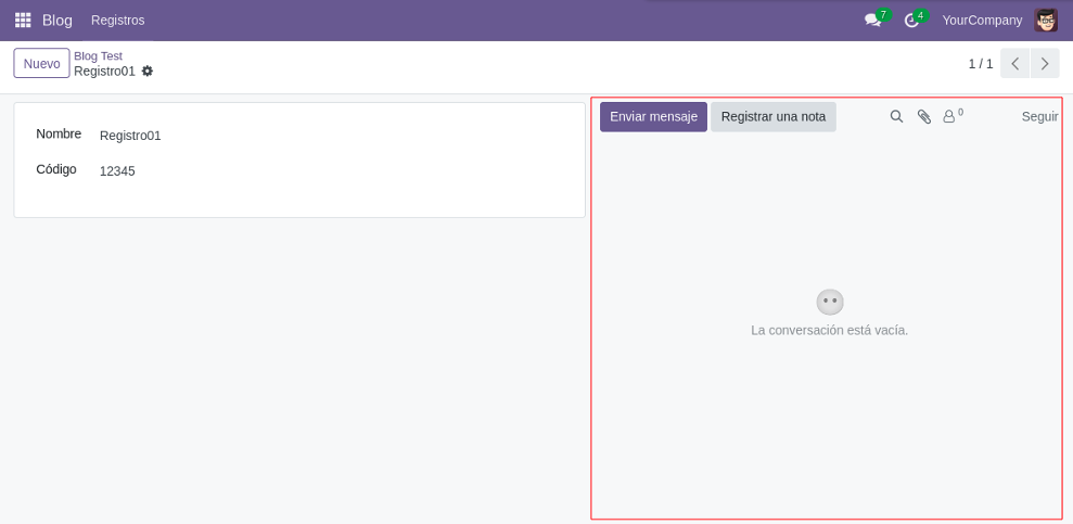 Una vez que se haya añadido la compatibilidad del chatter con nuestro modelo, los usuarios podrán añadir fácilmente mensajes o notas internas a cualquier registro de este modelo. Cada uno de estos enviará una notificación, y si se tienen ciertas configuraciones, estas notificaciones se pueden enviar por correo electrónico, además de responderse directamente desde su correo. Visualizamos el chatter actualizando el módulo y recargando la vista formulario del registro anterior.