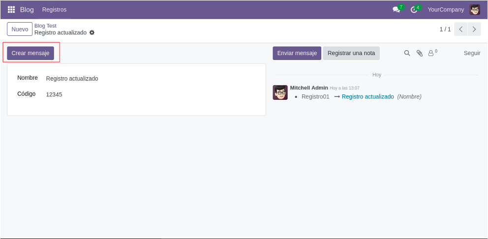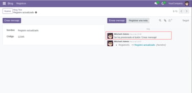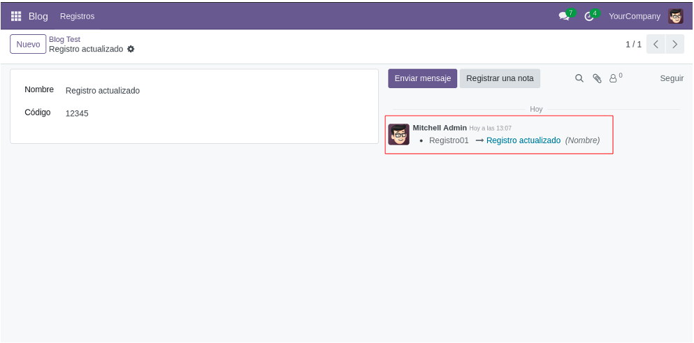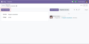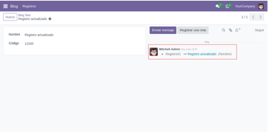 A partir de que se actualice el módulo con el cambio anterior, cada cambio que se haga sobre el campo ‘name’ se mostrará en el chatter. Por ejemplo, se actualiza el campo del registro anterior y se coloca ‘Registro actualizado’, lo cual se registra en el chatter: