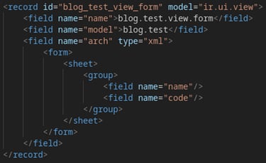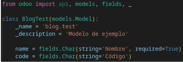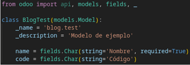 Dentro del módulo personalizado, creamos un modelo sencillo que tendrá de momento 2 campos: nombre y código. Añadimos su vista lista y formulario, así como una acción para llamar al modelo desde un menú raíz. El nuevo modelo se llamará blog.test. El código de la definición del modelo en Python es el siguiente: