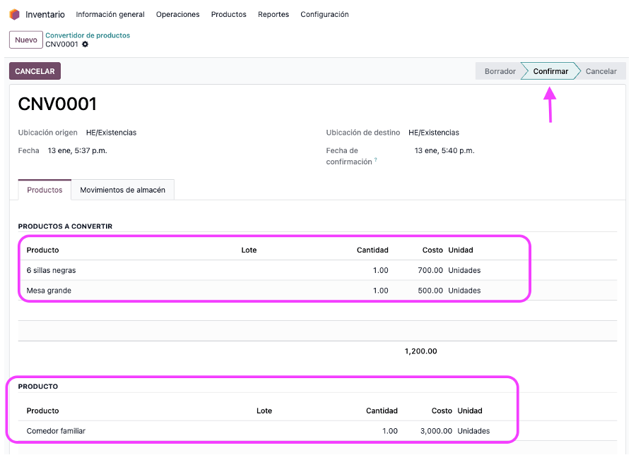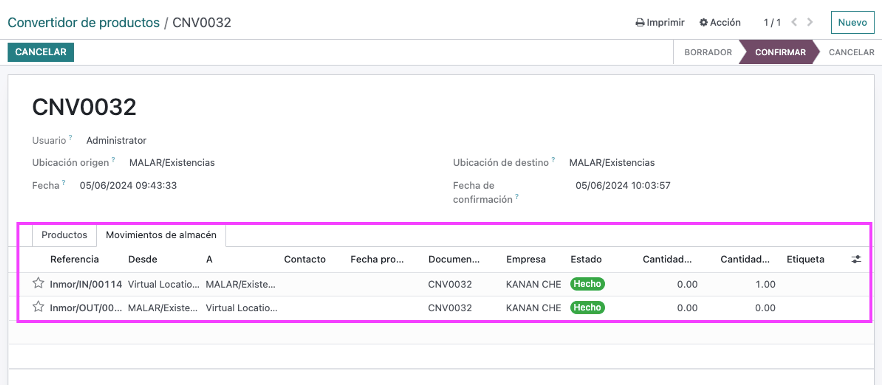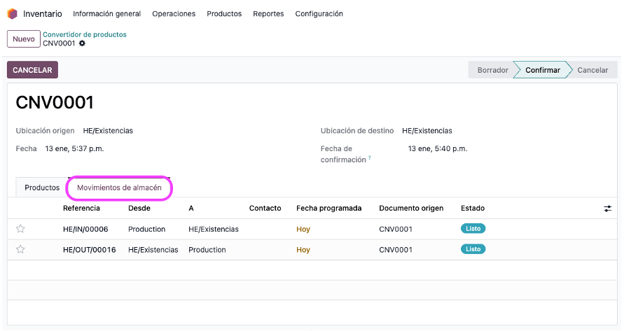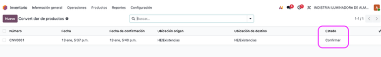 Se procede a confirmar dicho movimiento, si nos damos cuenta, al confirmar se coloca la fecha en la seccicón de “Fecha de confirmación”.