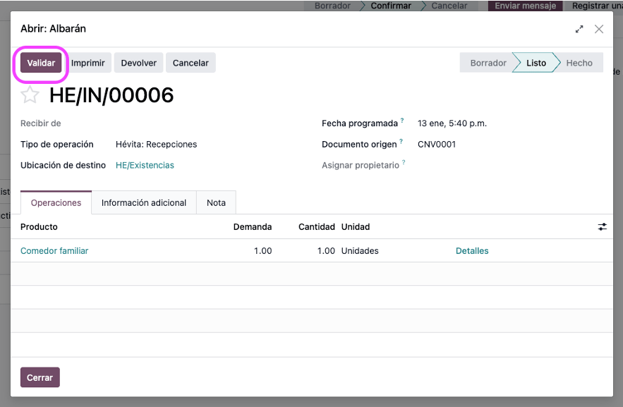 En el ejemplo del movimiento de folio CNV0001, podemos localizar que en la sección de “Movimientos de almacén”, en donde localizaremos la salida de los componentes y la entrada de nuestro producto final, con la intensión de que se validen dichos movimiento de LISTO a HECHO dandole clic al movimiento mencionado.