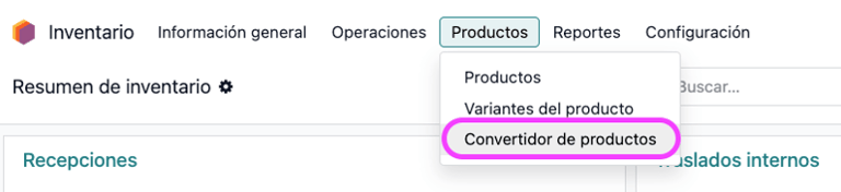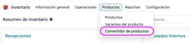 Podemos encontrar el módulo de convertidor de productos en el módulo de inventario > productos > convertidor de productos.