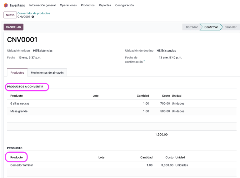 Para que puedas convertir productos, primero deberán estar creados en Odoo y deberán tener un costo para el cálculo.