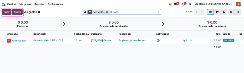 1. El módulo de Odoo te ofrece que los usuarios puedan dar de alta los gastos; en esta nueva versión puedes hacerlo adjuntando tu ticket o creando un nuevo gasto desde el módulo.