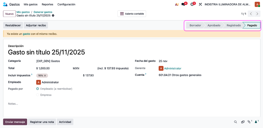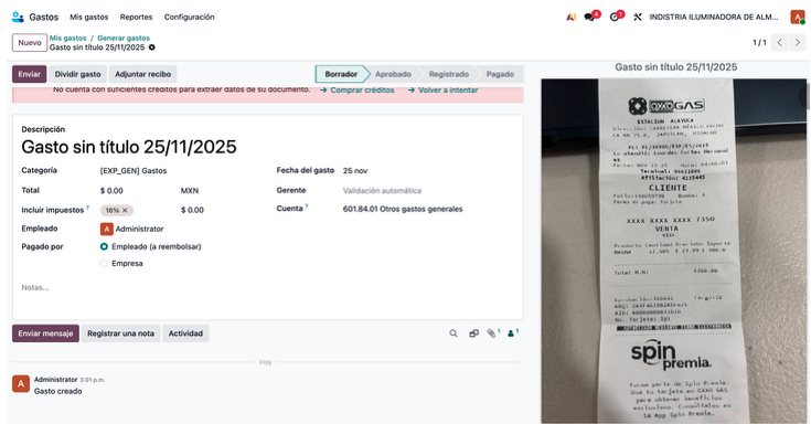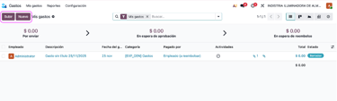 5. Recuerda que con Odoo puedes limitar a los usuarios para realizar ciertas funciones; en este caso se puede enviar el gasto, para que el área administrativa verifique si es correcta la información.