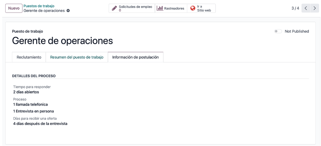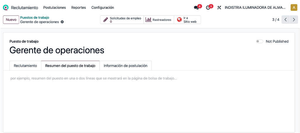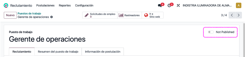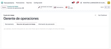Para publicar los puestos, debemos ir a la sección de puestos de trabajo y activar el botón de “Not published”; al hacer clic, este cambiará a color verde y estará publicado en la página.