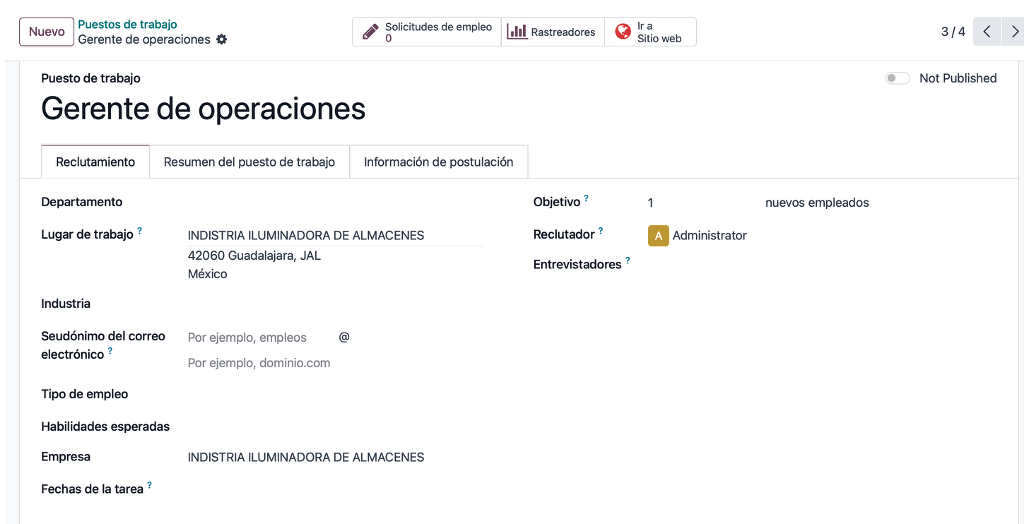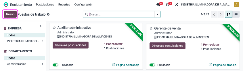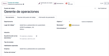 Para poder generar un nuevo puesto, vamos a ir al módulo de reclutamiento>Puestos de trabajo> Nuevo.