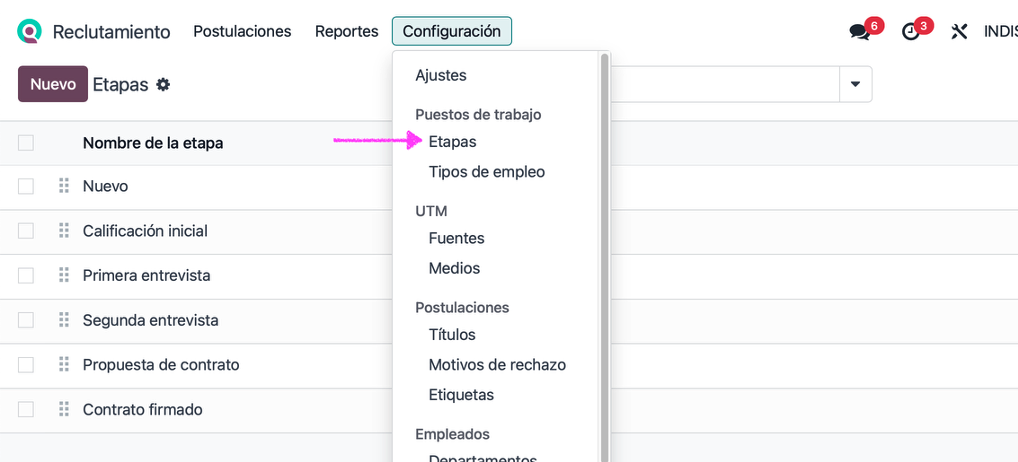 Para poder editar las etapas, vamos al menú de configuración>etapas, donde podemos ajustar las que nosotros necesitemos.
