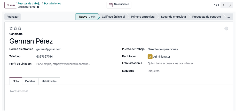 Dentro del registro de la postulación se podrán ver los datos que registró el usuario, así como su currículum adjunto; al igual que aquí, quien esté encargado del seguimiento podrá llenar habilidades, sueldos esperados, quiénes son los entrevistadores, entre otros.
