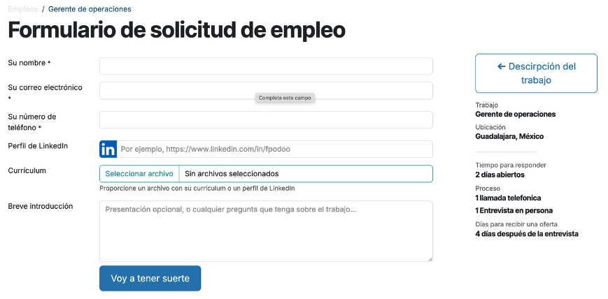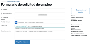 Al momento que un usuario solicita el empleo, tiene que llenar el siguiente formulario, donde podrá ingresar sus datos y subir su currículum.