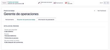 En la tercera pestaña vamos a poder colocar el proceso interno que se tiene para la contratación; este se publicará para que los candidatos puedan ver este proceso de contratación.