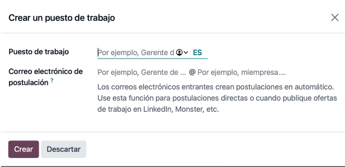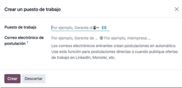 Nos aparecerá esta nueva pestaña para poner el nombre del puesto para contratación, y después podremos poner un correo a donde llegarán las notificaciones de los posibles candidatos o postulados.