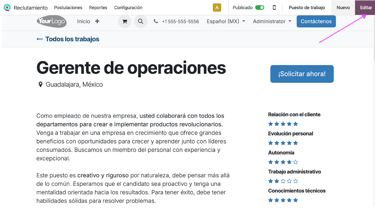 Ahora, desde el sitio web, puedes editar la publicación del puesto de trabajo y complementar ese anuncio más llamativo con la herramienta de sitio web de Odoo
