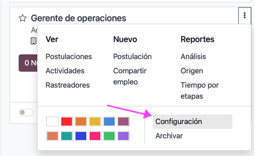 Para configurar especificaciones básicas de la contratación, debemos irnos al panel principal de puestos de trabajo, e irnos a los 3 puntitos e ir a la opción de configuración.