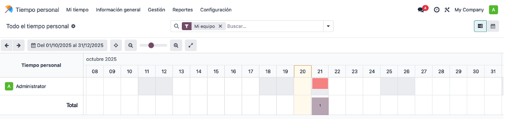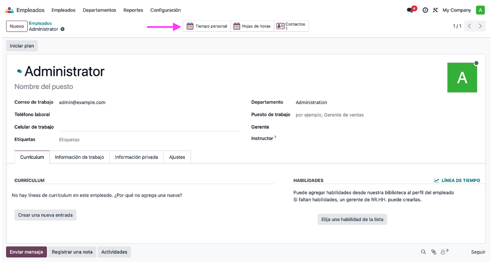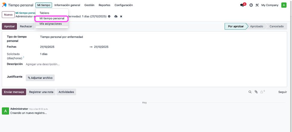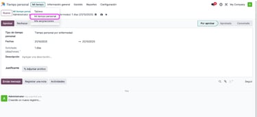 Es importante comentarte que este módulo de vacaciones/tiempo personal interactúa con el empleado, es decir, que cada registro que lleves en Odoo, por cada empleado, mostrará la trazabilidad de los días solicitados.