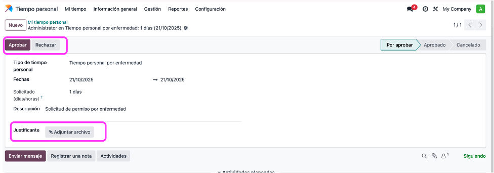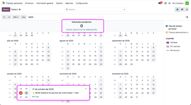 En el calendario de Odoo, se mostrará si hay solicitudes pendientes por aprobar; a su vez, si alguna solicitud se aprobó, se mostrará en dicho calendario.