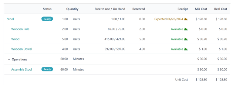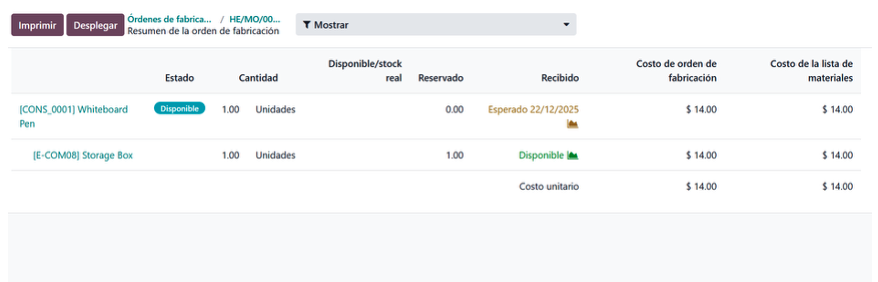 MO Cost (coste estimado): calculado a partir del BoM (componentes + costo esperado de operaciones).