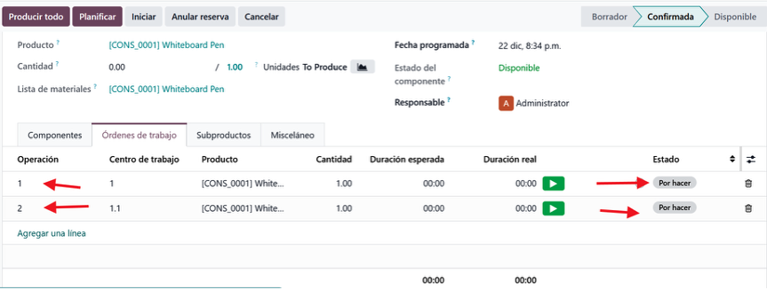Confirmar MO → Se generan movimientos y, si aplica, Work Orders basadas en las operaciones de la BoM.
