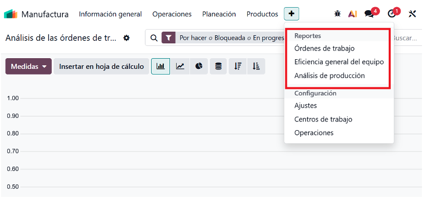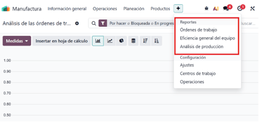 On Time Delivery (OTD) Reportes: Manufacturing → Reporting / Inventory → Reporting. También puedes crear vistas pivot o BI para dashboards más ricos.
