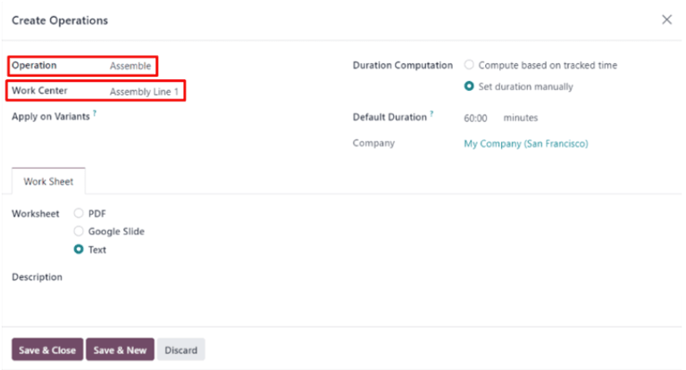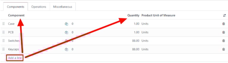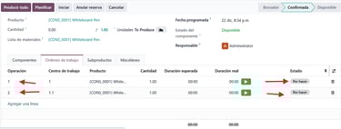 Operations: Si Work Orders activado, aquí defines las operaciones (ej. Cut, Assemble), la secuencia y el work center asignado. Estas operaciones se convertirán en Work Orders cuando se confirme una MO.