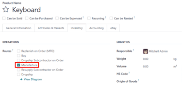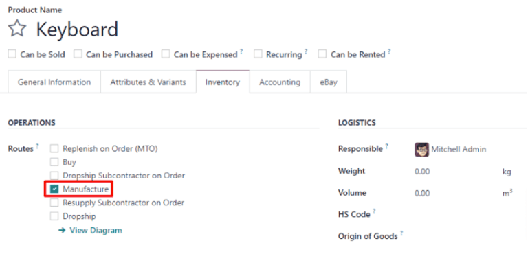 Routes: Aquí se marca si el producto es Manufacture, Buy, Drop-shipping o usa rutas personalizadas (ej. Make to Order). Esto define si la demanda genera MOs automáticamente.