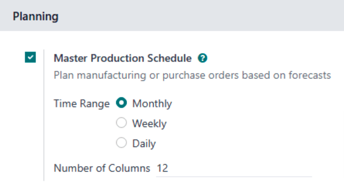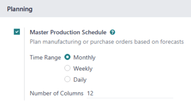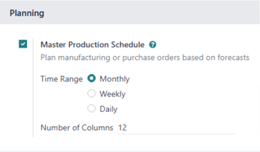 Master Production Schedule (MPS): Si vas a planificar por horizonte (meses/semanas/días), actívalo..
