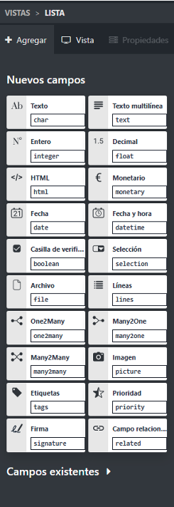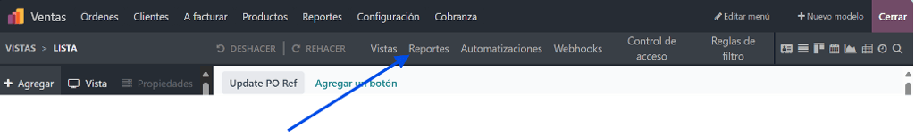 Views / Vistas: cambiar o crear vistas (form, list, kanban, calendar, graph, pivot, gantt).