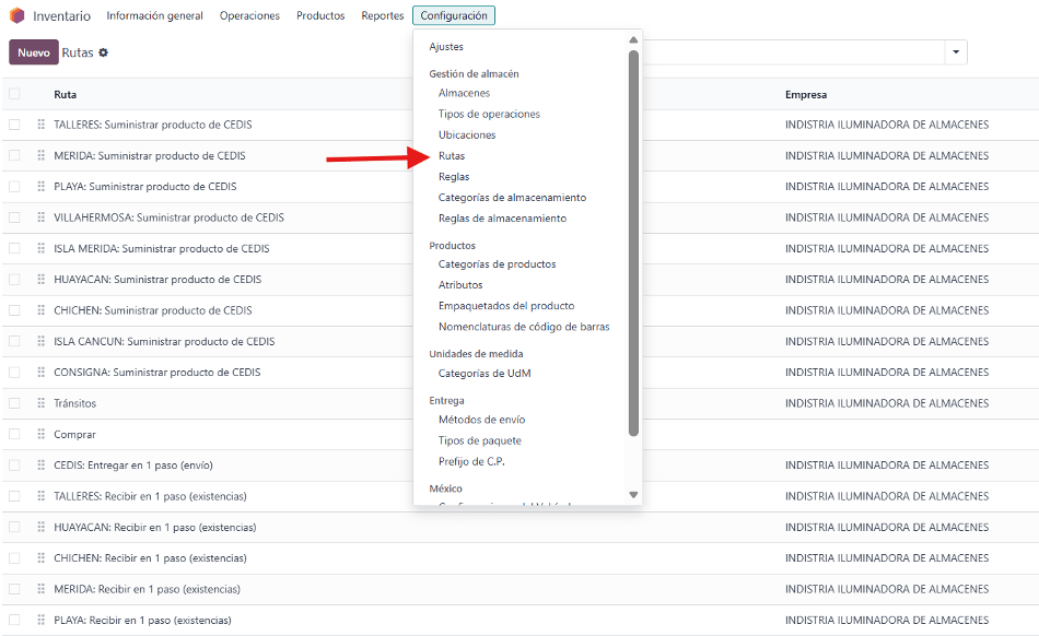 Inventario → Configuración → Rutas